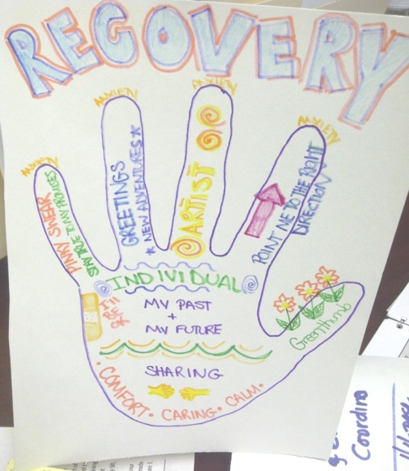 As a Peer Specialist, you can guide many creative activities and bring about new awareness. In this activity, people are first instructed to look at their hands. This creative project encourages participants to actively and creatively explore and express how their “hands” have contributed in their individual recovery journey. Oftentimes, we are not aware of how these two significant extensions of our bodies, have played such a vital role on our recovery journey. Whether to embrace ourselves and others, caress, console, give a “high five” for life, or push away things that are not good for our healing process. Are there rings on their fingers? Might help to talk about your own hands or samples of other peoples artistry of their hands.
