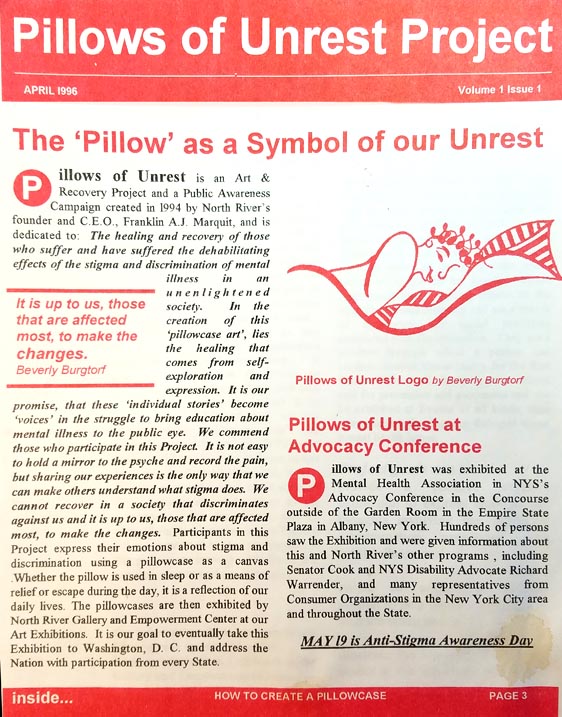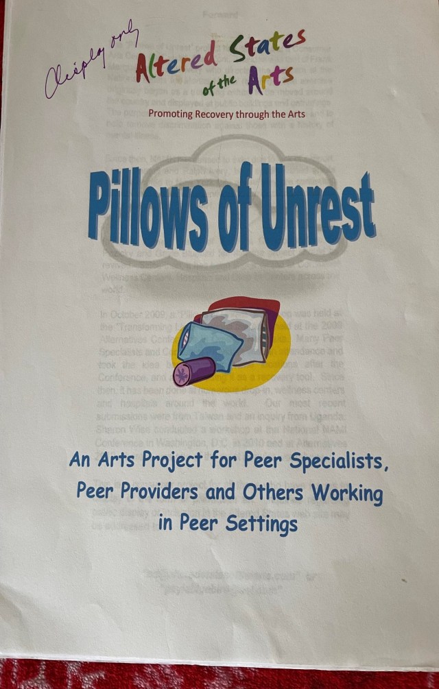 The original title was, “Pillowcases of Unrest,” of this signature project first done in Catskills of NY with one of the first peer run art centers under Frank Marquit.