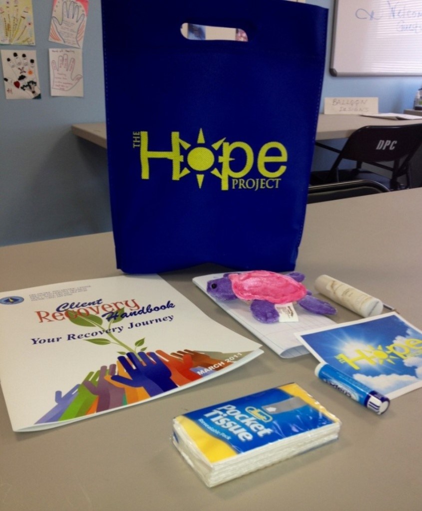 A hope tote in this example was for persons in inpatient units who were given this bag on admission to the state hospital in Delaware. We had to scrutinize very carefully what went into the bag for safety, but you can see some of the above that we included.