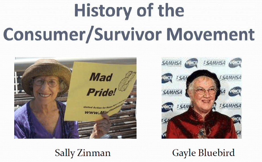 For presentation slides from a webinar on the history of the Consumer/Survivor Movement by Sally Zinman and Gayle Bluebird, click here.